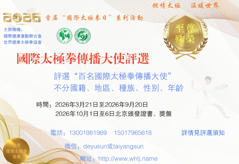 值此2026“首届国际太极拳日”来临之际,国际健康运动联合会太极拳专业委员会、世界健康太极拳协会联袂推出“百名国际太极拳传播大使”评选活动。旨在树立和培养太极拳界“模范标杆人物”,同时展现太极拳者风采魅力,以龙头引领作用,更好的推广和普及太极文化,推动人类健康事业,为促进国际友好交流添砖加瓦。
